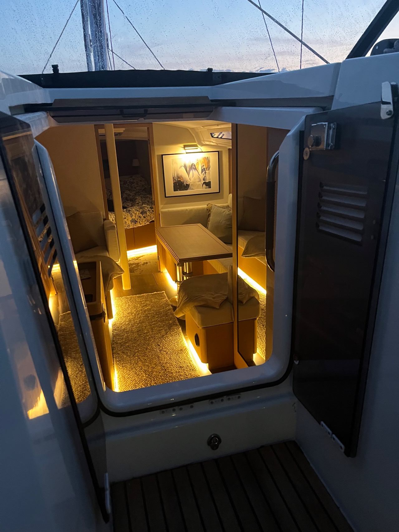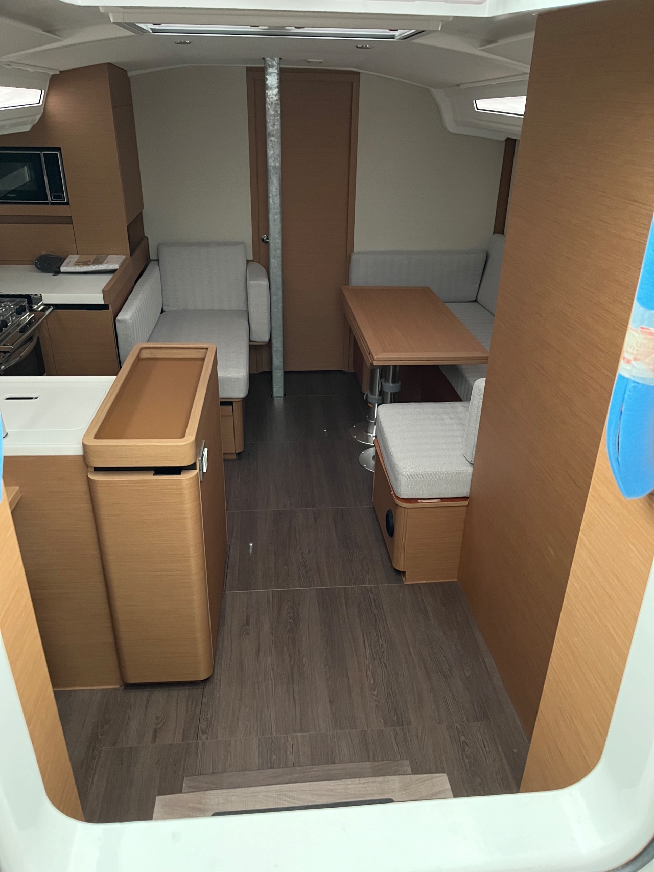 Ljus interiör med välplanerade kabiner och fullt utrustat pentry. Perfekt för familjesegling eller bekväm semester till sjöss.